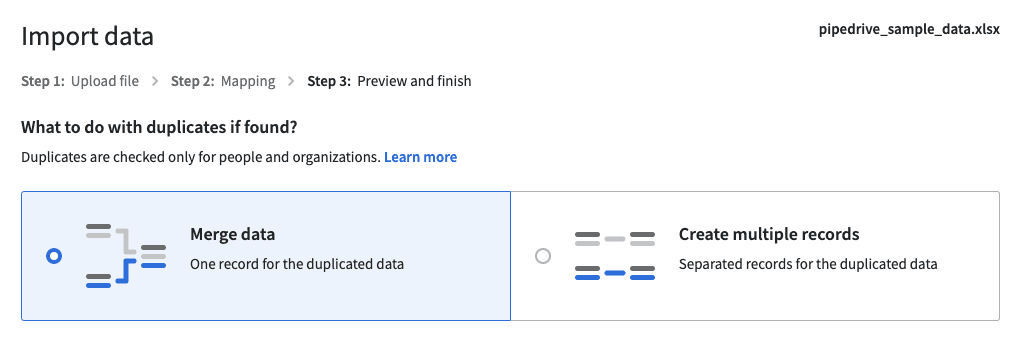 Tip: Als je je zorgen maakt over duplicaten voor contacten die al in je Pipedrive-account bestaan, kan de Merge Duplicates functie interessant voor je zijn. Hiermee kun je duplicaten van bestaande contacten samenvoegen en je gegevens opschonen.